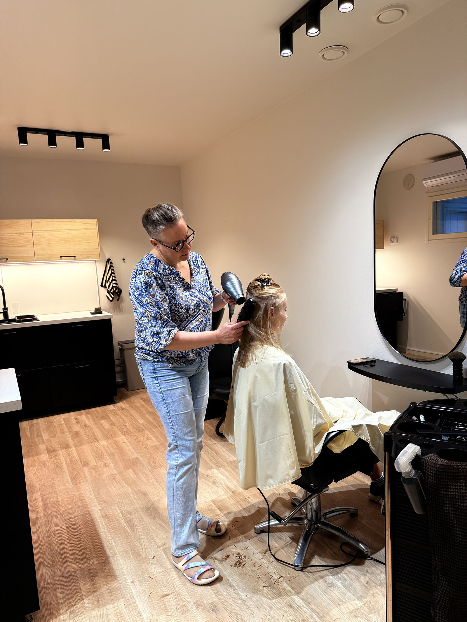 Tykkään haastaa itseäni, opetella uusia tekniikoita. Olen rohkea tekemään mallinmuutosleikkauksia ja luonnonkiharoiden hiusten leikkaaminen onnistuu myös hyvin.